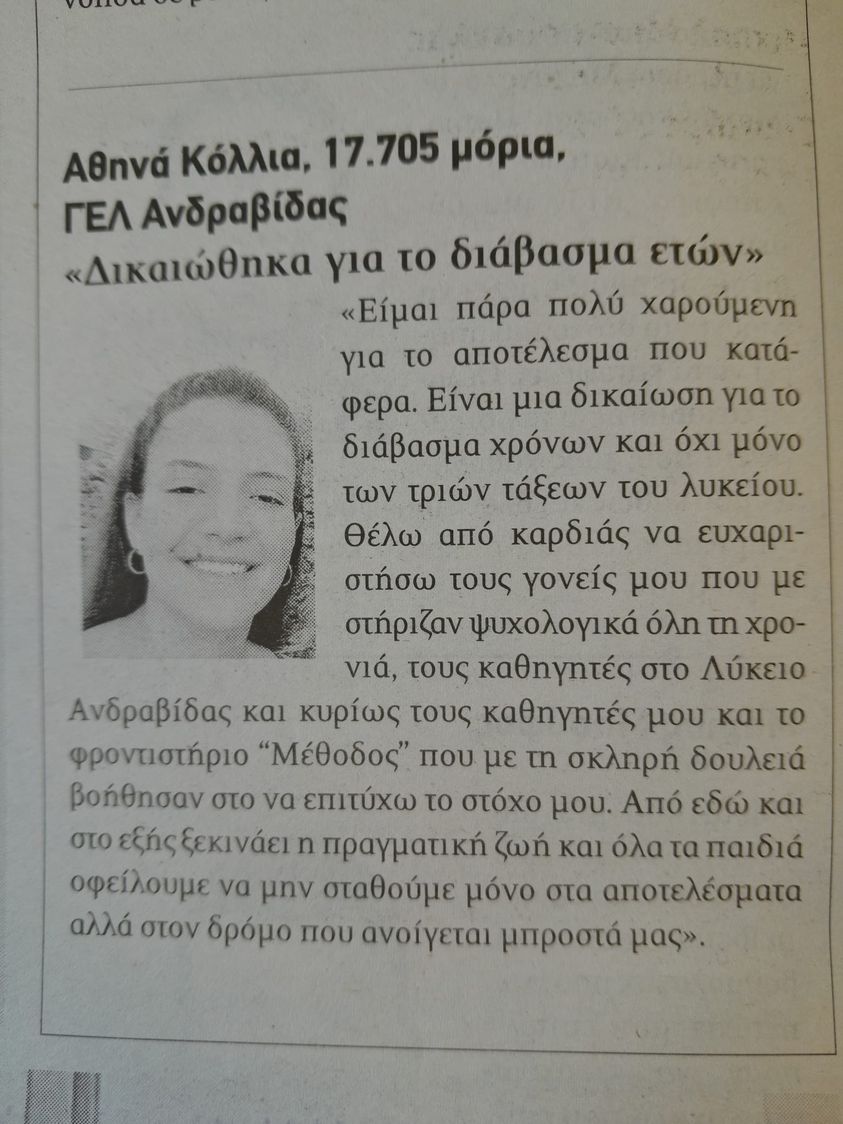 ΓΕΛ ΑΝΔΡΑΒΙΔΑΣπου με την επίδοσή της στις πανελληνιες εξετάσεις εφτασε τον βαθμό των 17.705 μορίων και είναι ετοιμη να φοιτήσει σίγουρα σε μια σχολη της επιλογής της ..